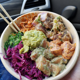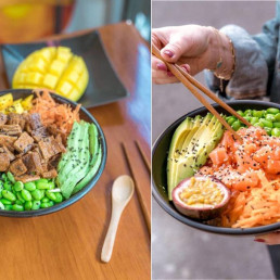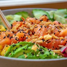 For those looking for a vegetarian option, the Poké Falafels bowl is a delicious choice. Crispy falafel, sautéed red peppers, fresh coriander, edamame beans, pickled carrots, and onions create a colorful and flavorful dish that will leave you wanting more.